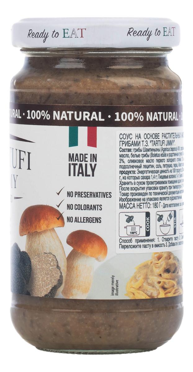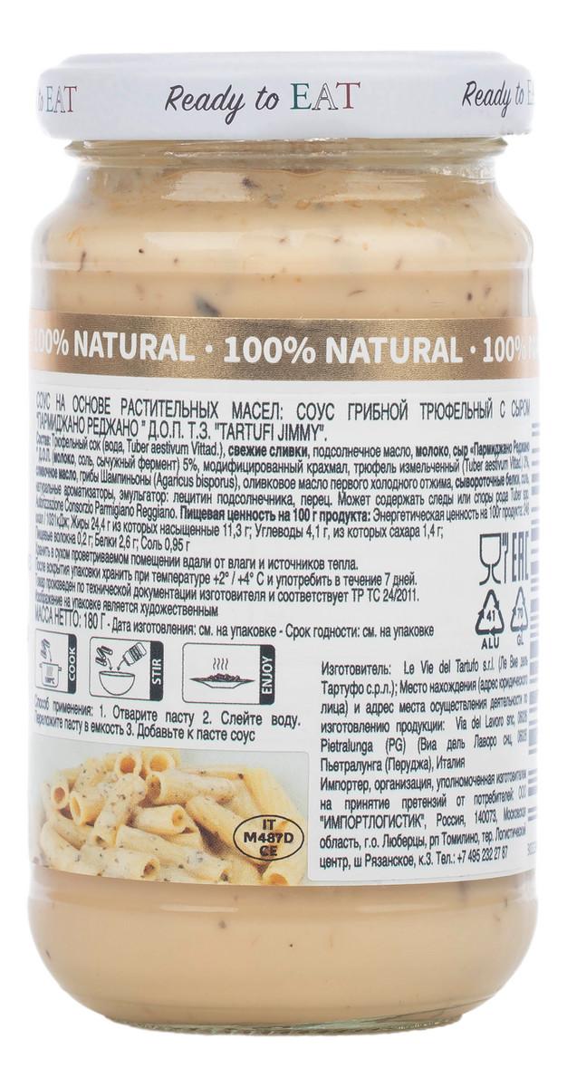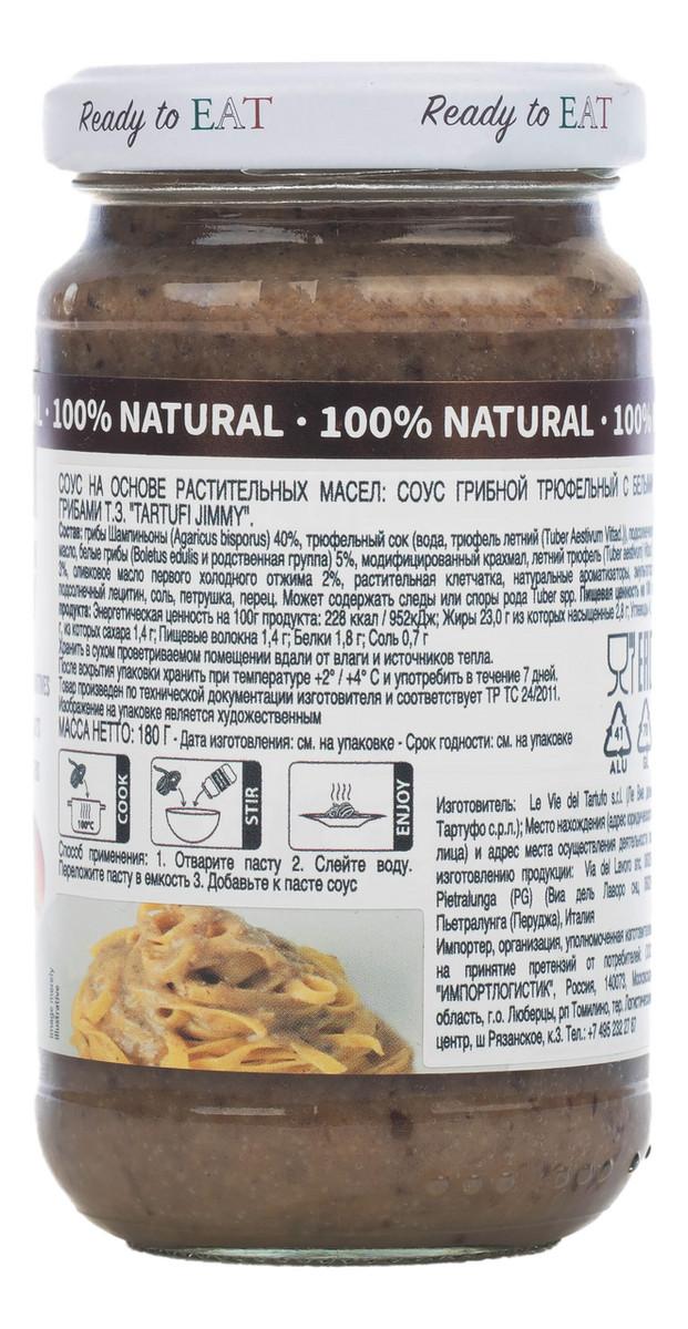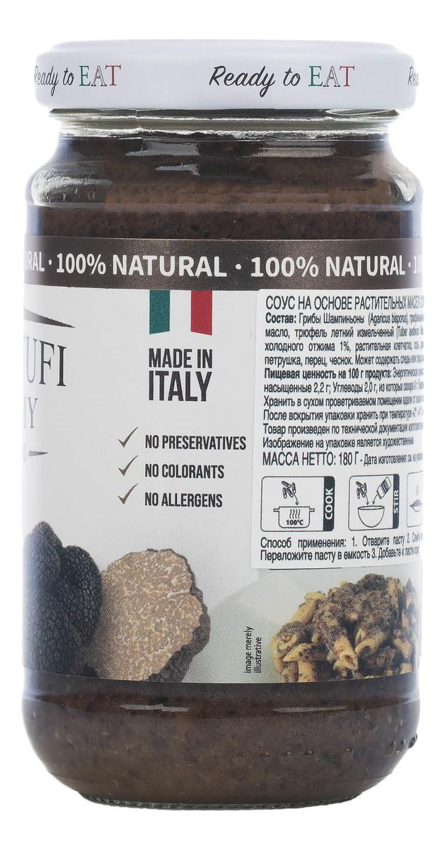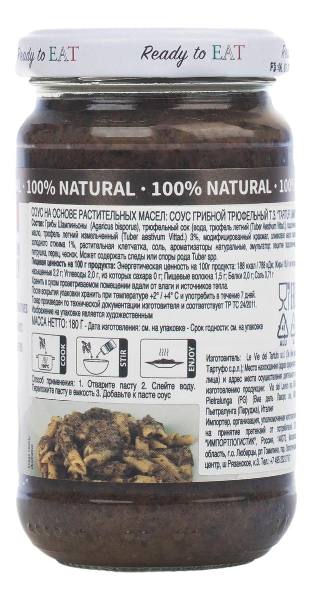 Состав: Грибы Шампиньоны, трюфельный сок, подсолнечное масло, трюфель летний измельченный 3%, модифицированный крахмал, оливковое масло первого холодного отжима 1%, растительная клетчатка, соль, ароматизаторы натуральные, эмульгатор: лецитин подсолнечника, петрушка, перец, чеснок.