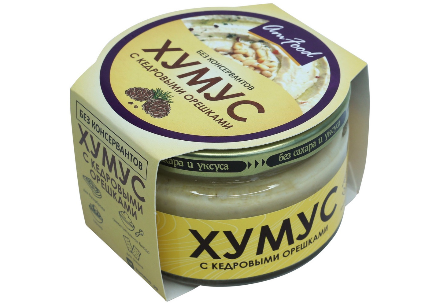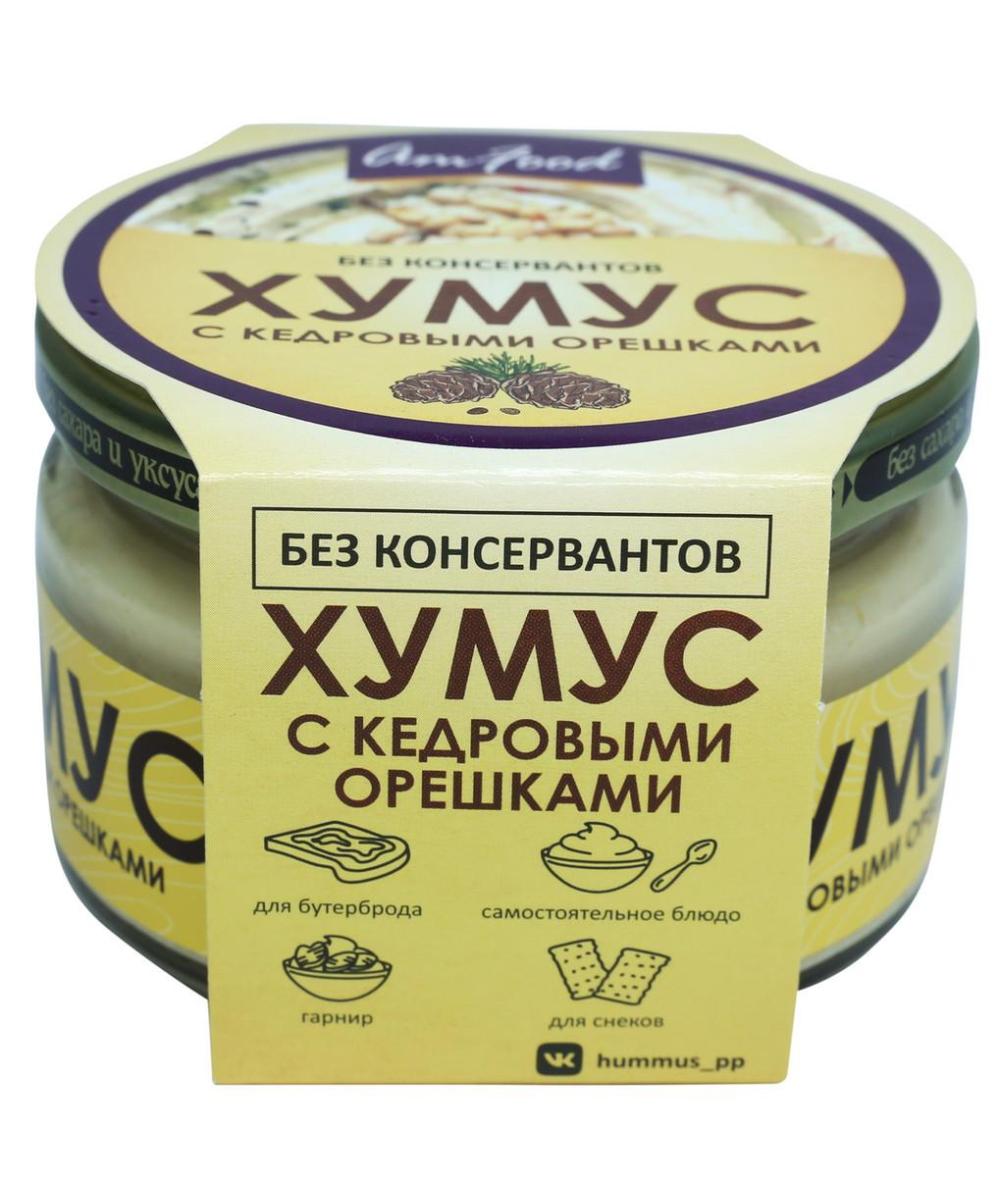 Нут, вода питьевая, кунжутная паста (тахина), масло подсолнечное, масло оливковое, орех кедровый жареный, соль, чеснок, регулятор кислотности (лимонная кислота), паприка, петрушка, перец красный молотый.
