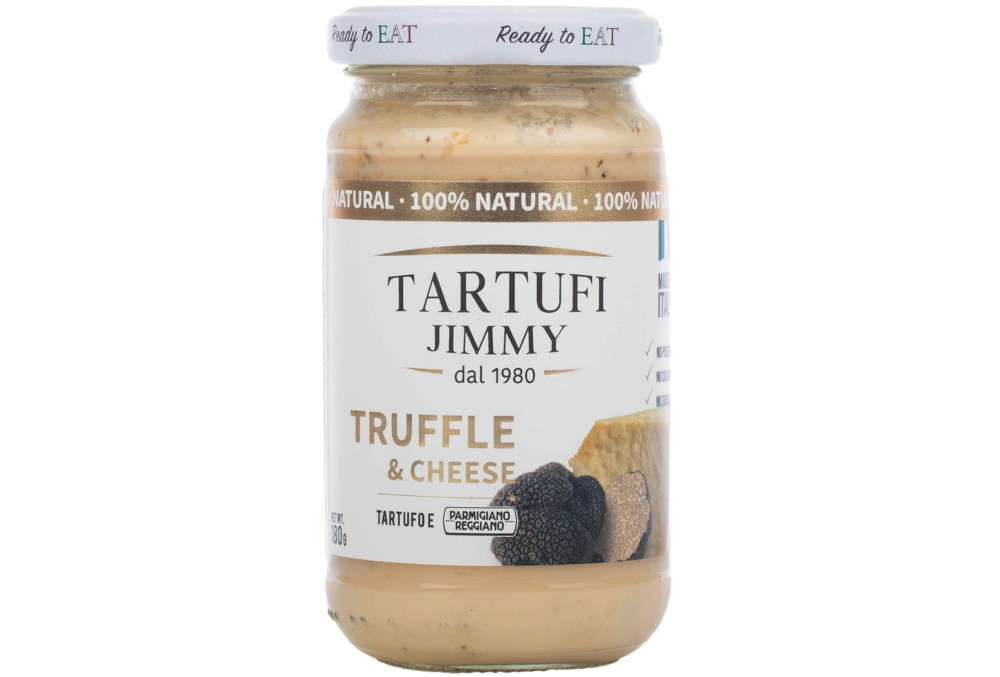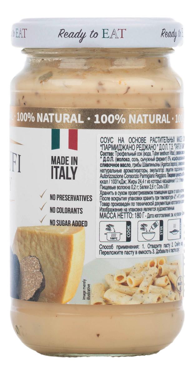 Трюфельный сок, свежие сливки, подсолнечное масло, молоко, сыр Пармиджано-Реджано (молоко, соль, сычужный фермент) 5%, модифицированный крахмал, трюфель измельченный, оливковое масло первого холодного отжима, сывороточные белки, соль, натуральные ароматизаторы, эмульгатор: лецитин подсолнечника, перец.