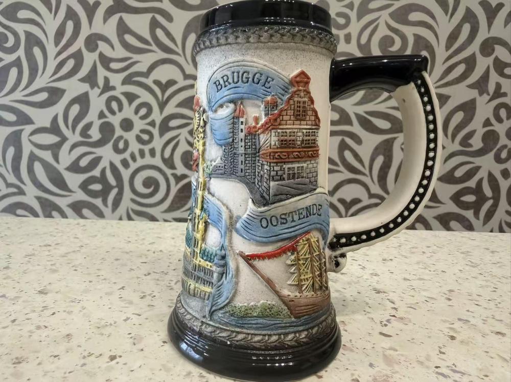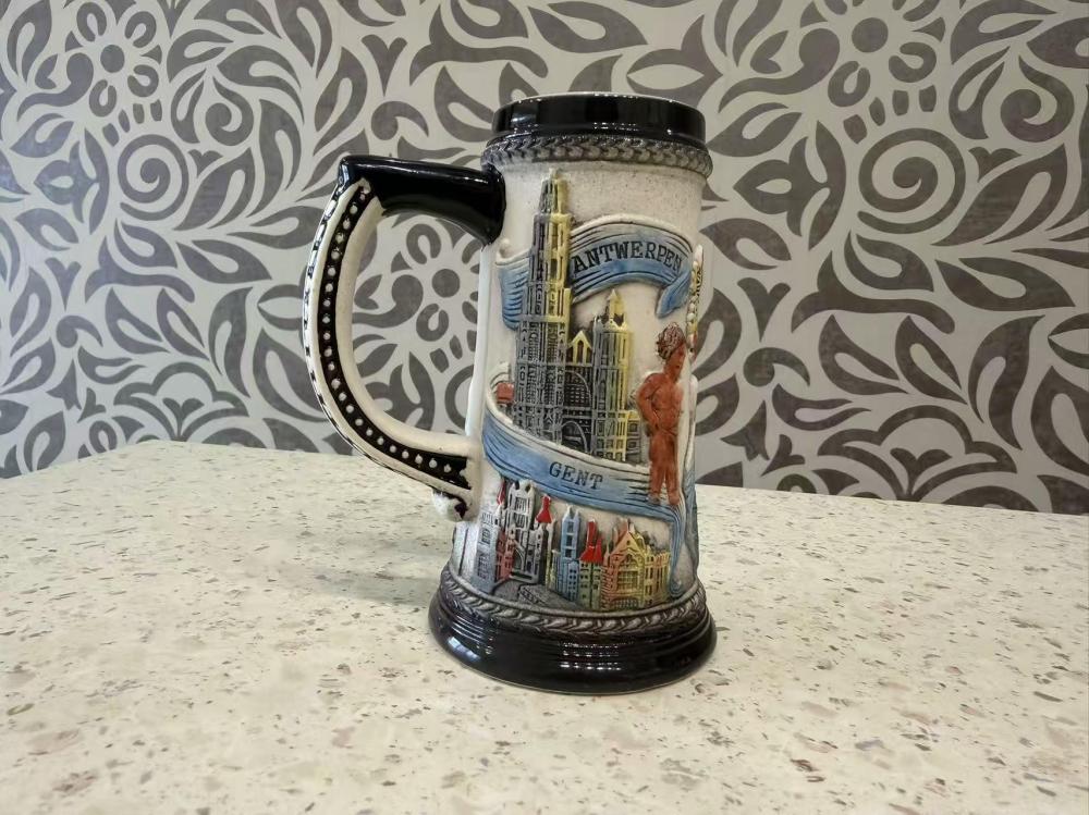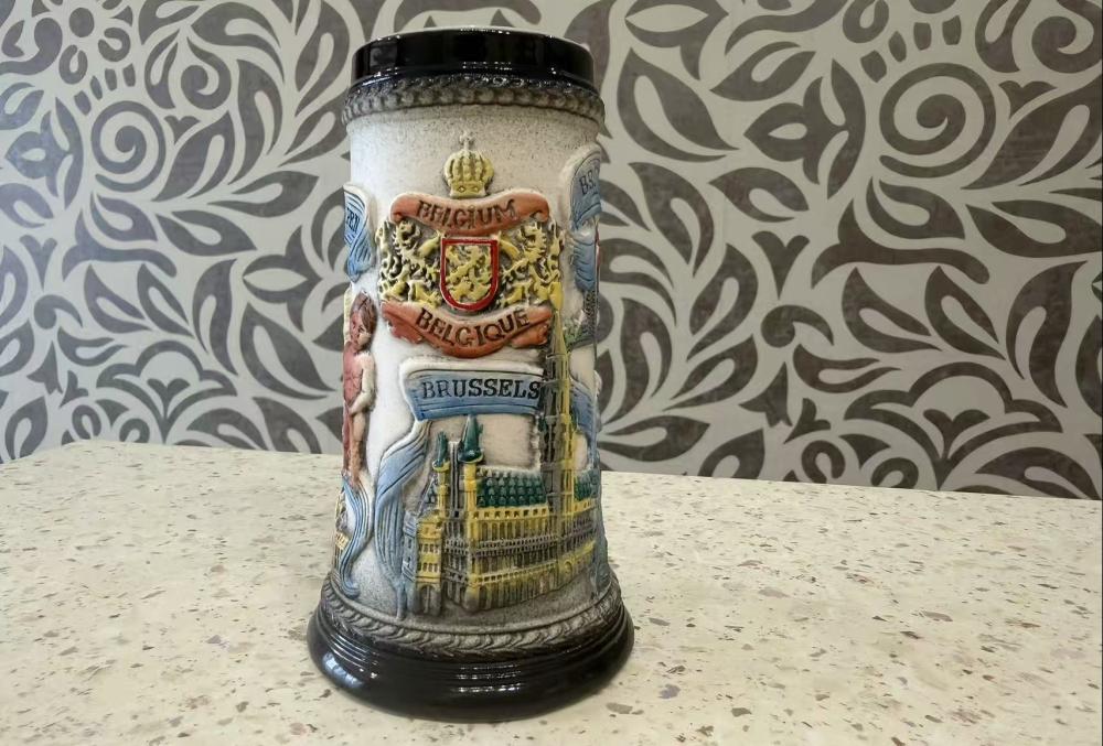 Это винтажная керамическая пивная кружка, произведенная в Бельгии, с рельефным изображением бельгийского герба, городского пейзажа Брюсселя и других бельгийских достопримечательностей.