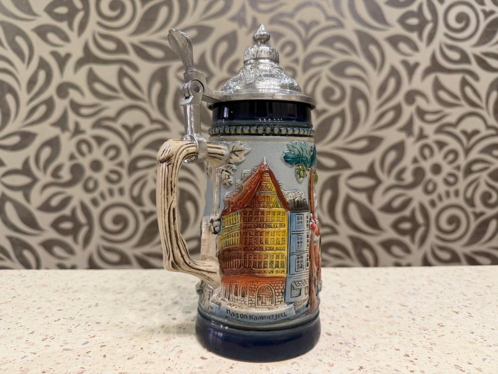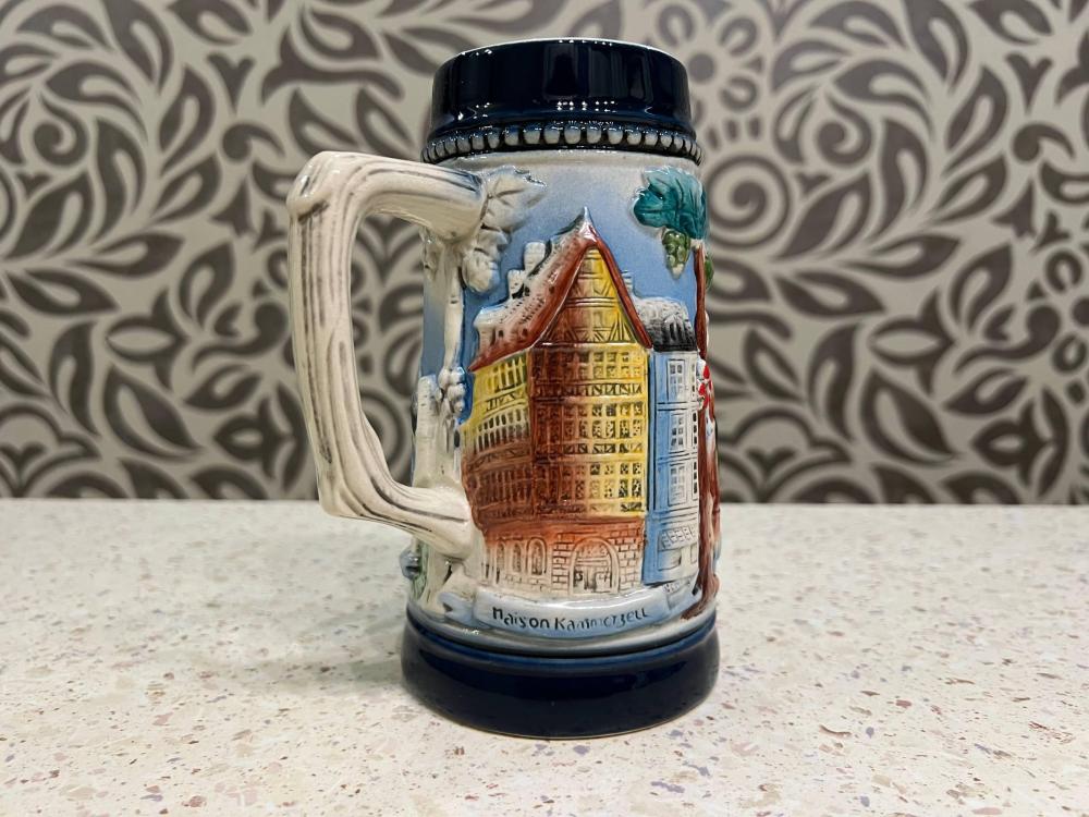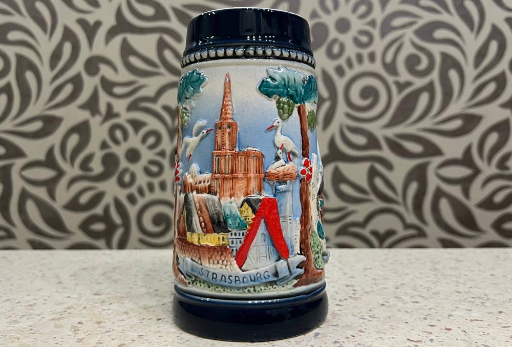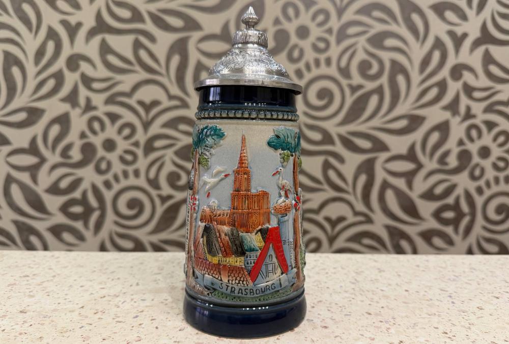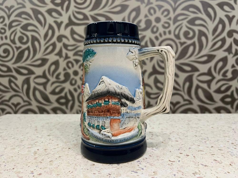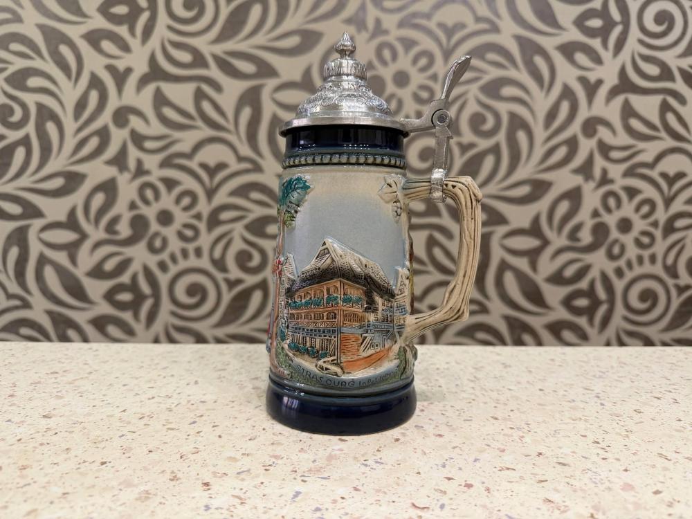 Это винтажная пивная кружка (биркрюг) в немецком стиле с рельефным панорамным изображением Страсбурга, столицы региона Эльзас.