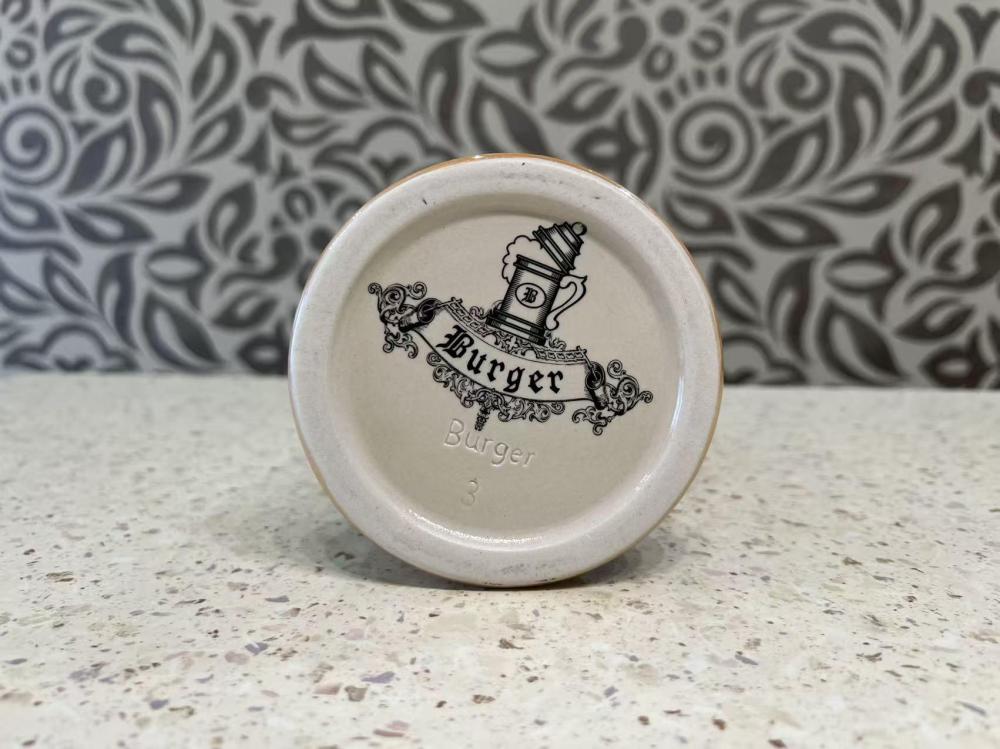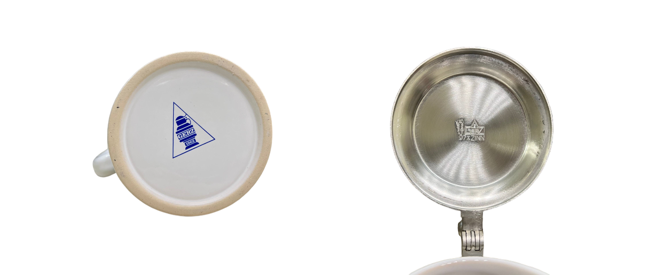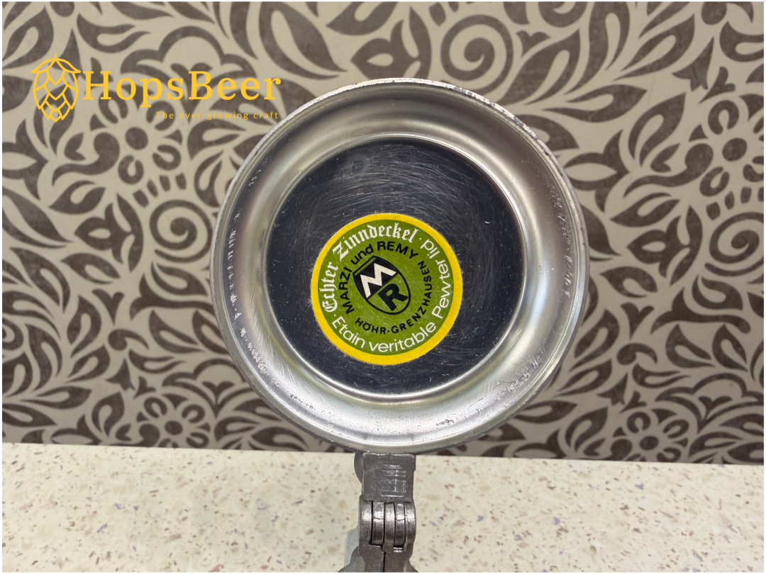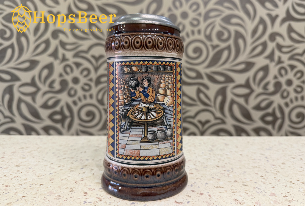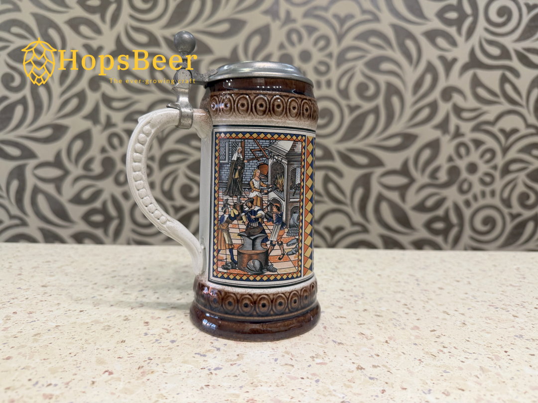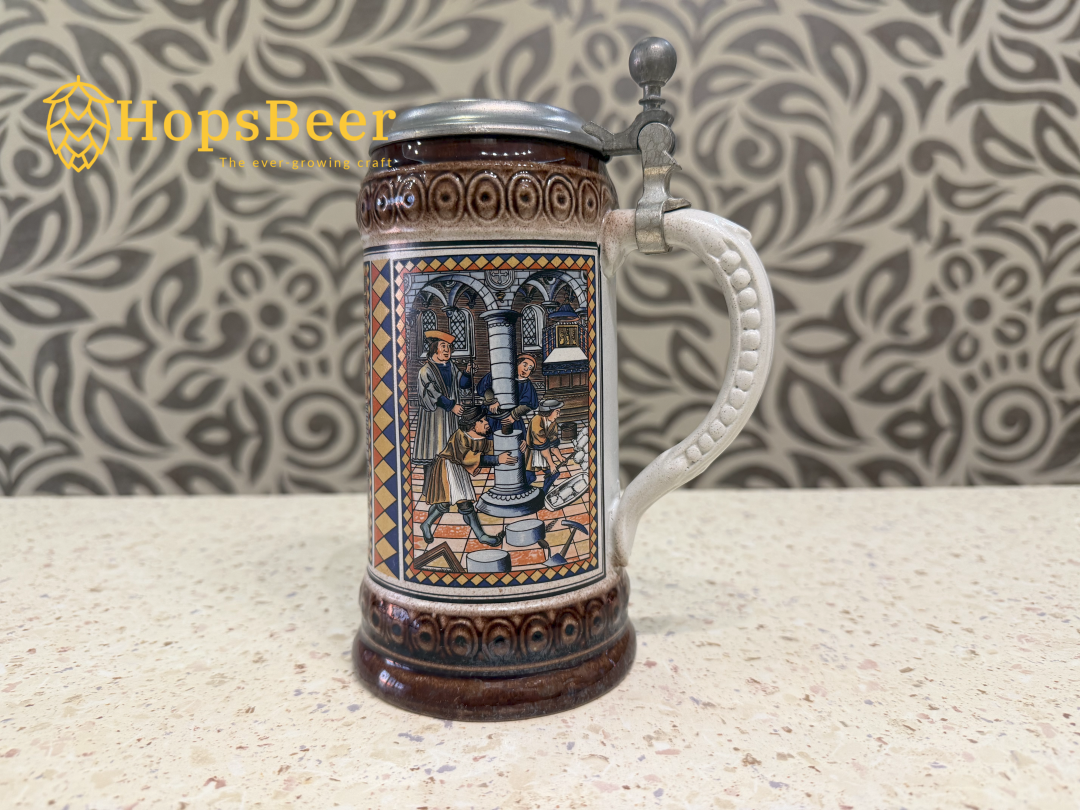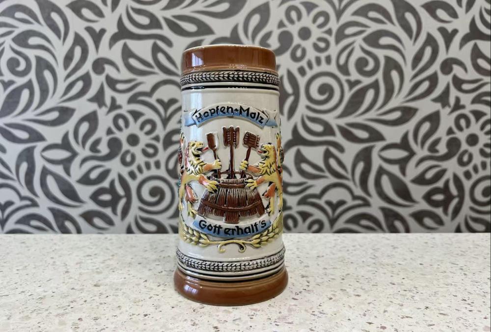 Винтажная немецкая керамическая пивная кружка производства компании Gerz. Она отличается рельефным изображением двух львов, держащих пивоваренные инструменты над пивной бочкой, и традиционной немецкой пивоваренной фразой: «Hopfen u. Malz, Gott erhalt's» (Хмель и солод, да сохранит их Бог).