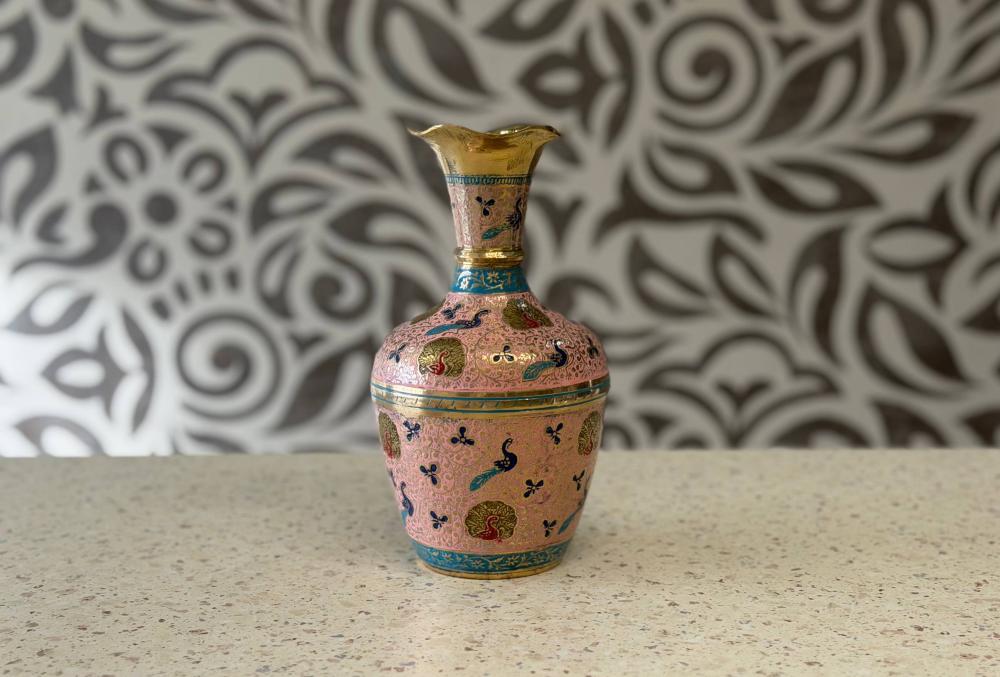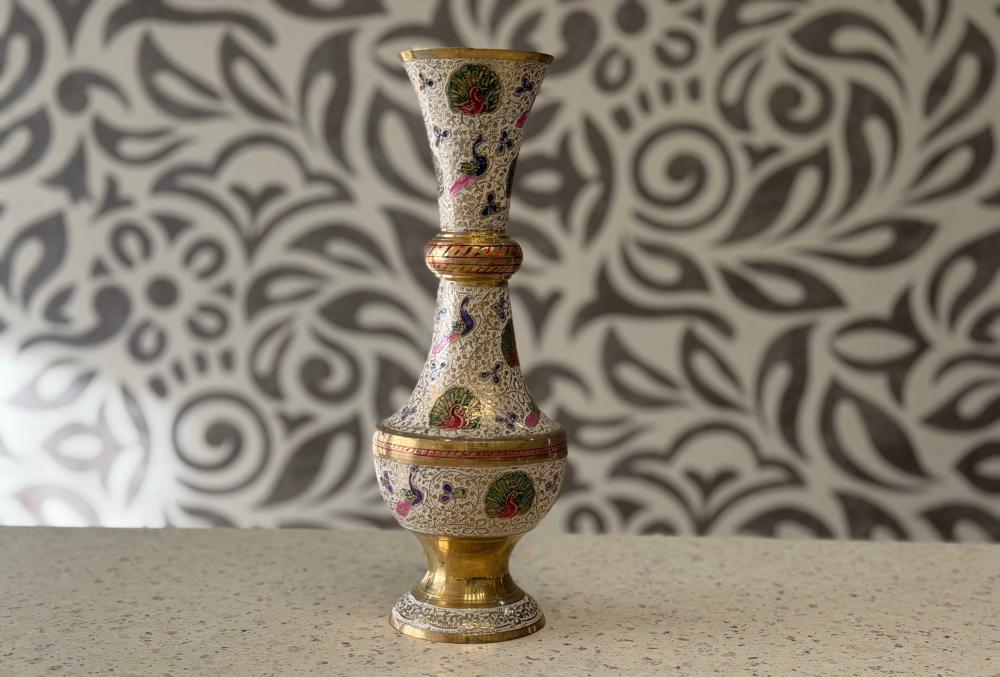 Декоративную латунную вазу для цветов с замысловатыми белыми и красочными мотивами павлинов, часто называемыми индийской техникой накаши.