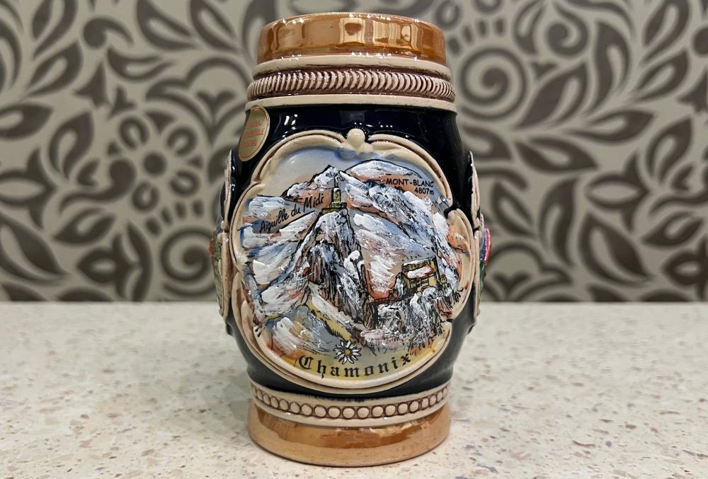 Это пивная кружка в немецком стиле, украшенная детальным рельефным изображением горного хребта Мон-Блан и вершины Эгюий-дю-Миди в Шамони.
