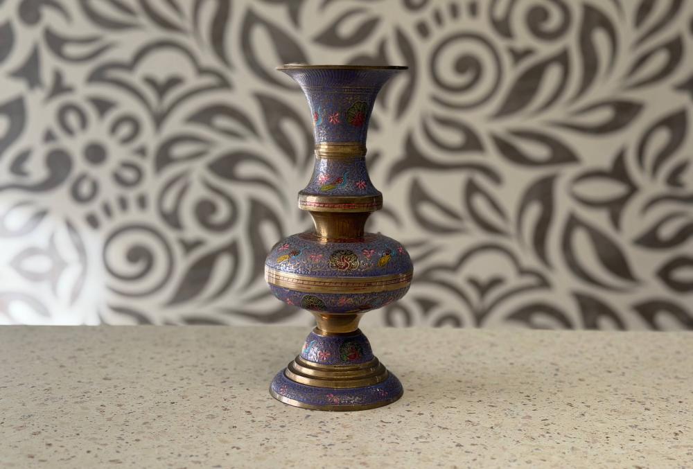 Винтажная латунная ваза с синей эмалевой инкрустацией и детальными цветочными или птичьими мотивами, типичными для индийской ручной работы.
